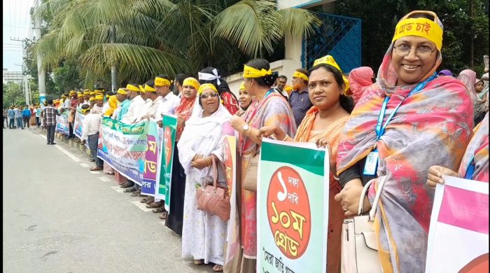সরকারি প্রাথমিক বিদ্যালয়ের সহকারী শিক্ষকদের দশম গ্রেড প্রদানের দাবিতে রাজশাহীতে মানববন্ধন করেছে শিক্ষক সমাজ। আজ দুপুরের দিকে পিটিআই এর সামনে এই মানববন্ধনে অংশ নেয় রাজশাহী জেলার সকল প্রাথমিক বিদ্যালয়ের সহকারী